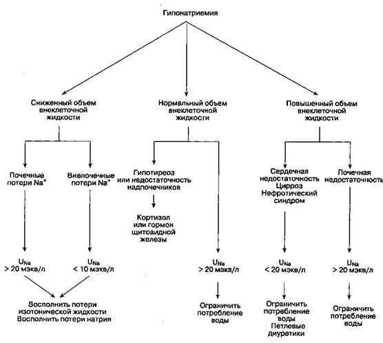 Рис. 28-4. Алгоритм лечения гипонатриемии. UNa — концентрация натрия в моче