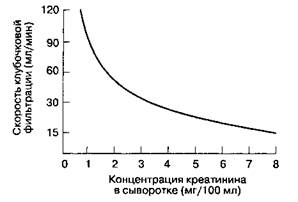 Рис. 32-1.Зависимость между концентрацией креатини-на в сыворотке и скоростью клубочковой фильтрации