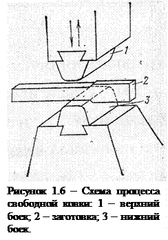 Процесс ковки – один из древнейших видов ОМД (рис.1.6.). Свободную ковку осуществляют между двумя бойками, один из которых (нижний) неподвижный, второй (верхний) совершает возвратно-поступательные движения вверх-вниз. При ходе вниз осуществляется пластическая деформация заготовки (рабочий ход), при ходе вверх (холостой ход) заготовку продвигают на ширину бойка. При этом, если необходимо обжимать заготовку по высоте и ширине, ее кантуют поочередно на 90о.