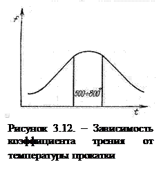 В зависимости от температуры прокатки коэффициент трения вначале увеличивается, достигая максимума при 500…800oC. Затем, при дальнейшем увеличении температуры он снижается (рис.3.12). Полагают, что основное влияние на коэффициент трения оказывает не собственно температура, а окалина на поверхности полосы. Образующийся при нагреве окисный слой, как абразив, способствует увеличению коэффициент трения. При повышенных температурах он размягчается и начинает действовать как смазка.