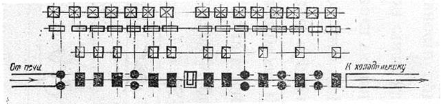Для прокатки более сложных профилей применяют полунепрерывные станы и станы с последовательным расположением клетей. Полунепрерывные станы используют для прокатки мелкого сорта. Они сочетают непрерывную черновую и линейную чистовую группы клетей (рис.7.14).