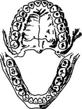 В тех случаях, когда не все верхние резцы прорезались (или отсутствуют) размеры ширины зубной дуги можно определить по сумме поперечных размеров нижних резцов (отношение ширины 4 верхних резцов к нижним как 1:0.74 по Тонну или как 4:3 по Эккелю).