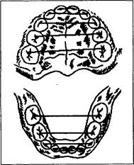 Измерительными точками по Пону на верхней челюсти являются середина Продольных Рис. 4. Измерительные точки по Пону фиссур первых премоляров и пе- Д"" верхней и нижней челюстей, редняя точка перекрещивания продольных и поперечных фиссур первых моляров. На нижней челюсти — точка между премолярами и срединная точка на вестибулярной поверхности первого моляра (рис. 4).