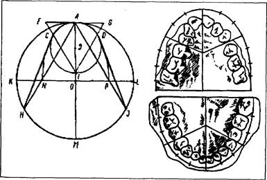 Для построения диаграммы измеряют ширину коронок трех верхних передних зубов (центрального и бокового резцов и клыка). Сумма этих размеров составляет радиус АВ. Из точки В описывают окружность радиусом АВ. От точки А с обеих сторон откладывают отрезки на окружности АС и AD, равные АВ. Дуга CAD представляет собой кривую расположения шести передних зубов. Для определения положения боковых зубов выполняют следующие построения. Из точки Е, на пересечении продолжения АВ с окружностью, проводят прямые через точки С и D и получают треугольник EFG. Радиусом, равным стороне FE (GE) треугольника EFG, из точки А отмечают на продолжении диаметра АЕ точку О, из которой описывают окружность радиусом FE. Из точки М на дополнительной окружности откладывают отрезки MJ и МН, равные АО. Соединив точку Н с точкой С и точку J с точкой D, получают кривую HCADJ, которая соответствует всей зубной дуге по Хаулею. На отрезках НС и DJ должны располагаться боковые зубы. Гербст объединил предложения Гербера и Хаулея, заменив боковые прямые линии дугами CN и DP. Центрами для этих дуг являются точки L и К, лежащие на диаметре, перпендикулярном диаметру AM.