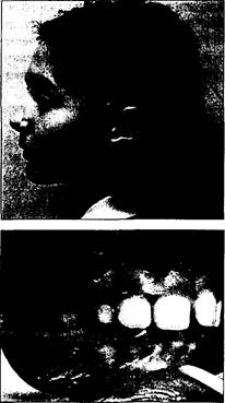 Лицевыми признаками верхней макрогнатии являются выступа-ние вперед средней части лица, зияние ротовой щели, выстояние верхних резцов с их обнажением. Нижняя губа подвернута под верхние передние зубы. Носо-губные и подбородочная складка сглажены, высота нижнего отдела лица может увеличиваться. Мягкие ткани, окружающие ротовую щель, напряжены (рис. 29).