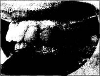Рис.43. Профиль лица и зубные ряды пациента с глубоким прикусом, обусловленным чрезмерным передним наклоном основания верхней челюсти и задним наклоном основания нижней челюсти. На левом снимке видно уменьшение нижней части лица.