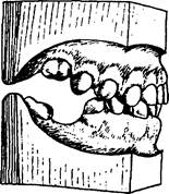 При осмотре зубных рядов видно, что передние зубы верхней и нижней челюсти не смыкаются, и между ними имеется щель (вертикальная, горизонтальная) величиной от нескольких миллиметров до 1 см и более. Эта щель может располагаться между резцами и клыками при смыкании всех других боковых зубов. При резко выраженных формах открытого прикуса смыкаются лишь вторые моляры или зубы мудрости. Наблюдаемая щель может явиться следствием неполного прорезывания передних зубов, недоразвития верхней челюсти в области межчелюстной кости, выраженной деформацией нижней челюсти.