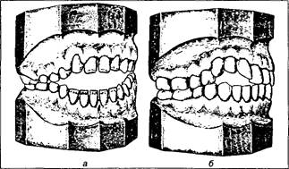 1) при суженном верхнем зубном ряде его боковые зубы укладываются в продольные межбугорковые фиссуры нижних боковых зубов (двусторонняя вестибулоокклюзия) (рис. 50 а);