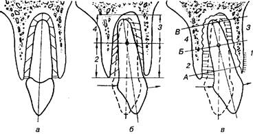 Наклон зуба происходит вокруг неподвижной точки оси вращения, положение которой зависит от многих условий, и в частности от длины корня и коронки, точки приложения силы, анатомической особенности лунки зуба и др. Благодаря этому образуется не две, а четыре зоны, где развертываются тканевые преобразования: две зоны давления (1 и 4) и две зоны натяжения (2 и 3). В зонах давления появляются остеокласты и происходит резорбция внутренней стенки,