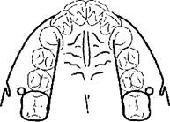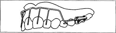 проволочной дуги (толщиной 0,9—1,0 мм), расположенной высоко в преддверии полости рта (на уровне половины длины корней зубов) и укрепляемой при помощи замков на кольцах. От дуги отходят вертикально вниз пружинящие отростки (толщиной 0,5—0,6 мм), направленные к тем зубам, которые подлежат перемещению в небную сторону. Аппарат довольно выгоден в эстетическом отношении (рис. 56).