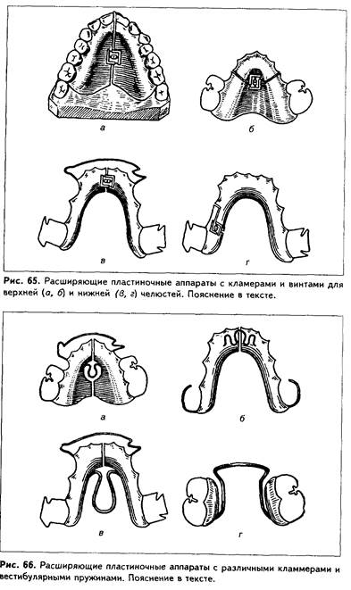 тем самым воздействие на альвеолярный отросток верхней челюсти. Лечение такими аппаратами, как правило, проводится в течении 1 месяца, однако в дальнейшем на протяжении еще 2-6 месяцев аппарат должен оставаться во рту, закрепляя результат лечения. Данный метод лечения может применяться, начиная с детского возраста в тех случаях, когда происходит неравномерное развитие челюстей при необходимости расширить зубной ряд более чем на 5 мм, а также тогда, когда сужение верхней челюсти является ведущим симптомом аномалии.