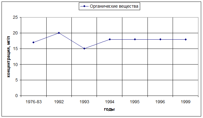 На рисунках 1, 2 приведены графики динамики средних концентраций загрязняющих веществ в воде р. Иртыш (с. Татарка) во входном створе за период 1976 - 83 – 1999 гг.. По характерным загрязняющим веществам: органические, нефтепродукты, железо, фенолы – пик загрязнений приходится на 1992 г., затем заметна тенденция снижения этих веществ в воде. Примерно с этого же года отмечается спад производства и уменьшение сбора загрязненных вод как на территории РФ, так и на территории Казахстана (согласно «Водохозяйственного баланса р. Иртыш (от границы Омской области РФ и Казахстана до р. Тара» ЗАО ПО «Совинтервод», М., 2001 г.). Сравнительные показатели качества воды р. Иртыш за период 1976 – 1983 гг. и 1992 – 1999 гг. приведены в таблице 4.20.