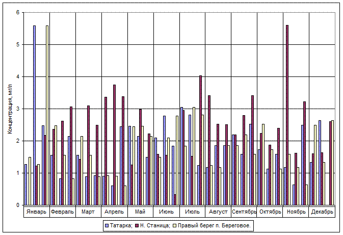Данные по БПК 5 изменяются от 1,18 мг/дм3 до 8,37 мг/дм3. Величина БПК 5. равная 8,37 мг/дм3, зарегистрирован как единичный случай на период исследований в сезон подъема весеннего половодья. Данное превышение ПДК в 2,79 раз свидетельствует о поступлении в этот период в водоем органических загрязнений с поверхностным стоком и о развитии процессов нитрификации.