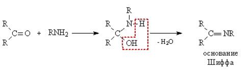3. Взаимодействие с аммиаком и аминами. Реакция взаимодействия с аммиаком и аминами идет по типу «присоединение-отщепление», на первой стадии происходит присоединение аммиака или амина, а на второй стадии происходит отщепление воды с образованием двойной связи между карбонильным атомом углерода и атомом азота аминогруппы. Таким образом, образуются соединения, называемые основаниями Шиффа – соединения, содержащие фрагмент >C=NR. Соединения, образованные присоединением аминов, называются имином, гидроксиламином – оксимом, гидразином – гидразоном.