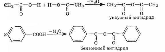 б)При нагревании кислот с водоотнимающими средствами получаются ангидриды карбоновых кислот R—СО—О—СО—R':Ангидриды — очень реакционноспособные соединения. Ангидриды - летучие жидкости, с резким запахом. Большое техническое значение имеет уксусный ангидрид, кроме того он применяется для синтеза фармацевтических препаратов, красителей.