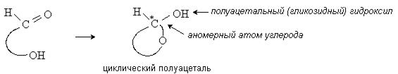 Карбонильная и гидроксильная группы моносахаридов взаимодействуют внутримолекулярно с образованием циклического полуацеталя:
