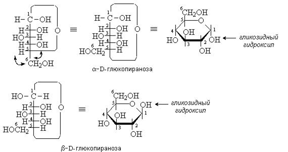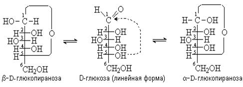 При этом возникает новый хиральный центр за счет образования свободного полуацетального гидроксила – бывший карбонильный, а теперь аномерный атом углерода. Наиболее устойчивы циклические полуацетали, содержащие шестичленный (пиранозный) или пятичленный (фуранозный) циклы. Они образуются при взаимодействии альдегидной группы с гидроксильной группой в положении 5 или 4 моносахарида соответственно. На рисунке представлена схема образования циклических форм D-глюкозы:
