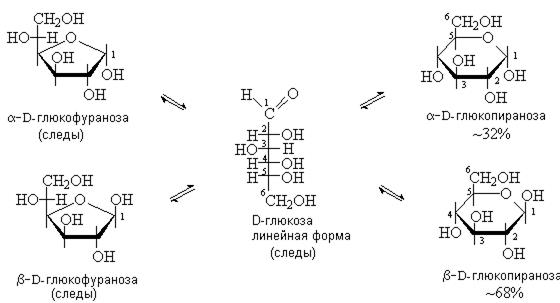 В кристаллическом состоянии моносахариды находятся в одной из циклических форм. При растворении образуется равновесная смесь линейной и циклических форм. Их относительное содержание определяется термодинамической стабильностью. Циклические, особенно пиранозные формы, энергетически более выгодны для большинства моносахаридов. Например, в растворе D-глюкозы преобладает β-D-глюкопираноза: