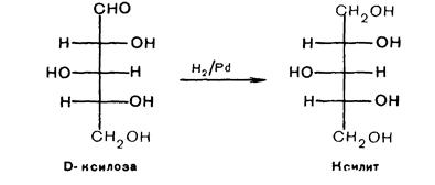 1. Восстановление.При восстановлении карбонильной группы альдоз образуются многоатомные спирты – глициты. Эти кристаллические легко растворимые в воде вещества обладают сладким вкусом и часто используются как заменители сахара при сахарном диабете (ксилит, сорбит).