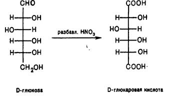 При действии сильных окислителей (разбавленной азотной кислоты) окисляется оба конца углеродного скелета альдоз и образуются гликаровые кислоты, например, D-глюкозы образуется D-глюкаровая кислота.