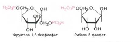 4. Реакция фосфорилирования моносахаридов.Моносахариды, этерифицированные фосфорной кислотой, играют исключительно большую роль в обмене веществ. Первым обнаруженным в природе фосфорнокислым эфиром углевода был фруктозо-1,6-бисфосфат, который выявили при брожении Л.А. Иванов, а также А. Гарден и В. Юнг в 1905 г. Ниже приводятся формулы некоторых фосфатов сахаров, играющих важную роль в обмене веществ: