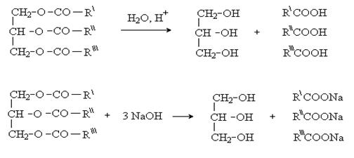 Химические свойства триацилглицеридов определяются наличием сложноэфирной связи и ненасыщенностью. Как сложные эфиры триацилглицериды гидролизуются под действием кислот и щелочей. Триацилглицериды подвергают гидролизу в кислой и щелочной средах, а также ферментативному гидролизу под действием фермента липазы.