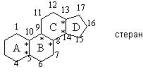 Стероиды – природные биологически активные соединения, основу структуры которых составляет углеводород стеран - циклопентанпергидрофенантрен. Циклы А, В, С образуют фенантрен. Как и терпены стероиды относятся к изопреноидам и связаны с ними общими путями биосинтеза.