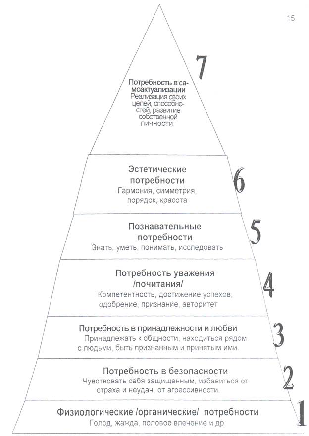 Классификация человеческих потребностей по иерархически построенным группам была предложена А. Маслоу. У человека, согласно его концепции, с рождения последовательно появляются и сопровождают личностное взросление 7 классов потребностей.