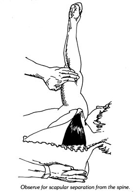Тестирование: Давление на руку по направлению к полу или в направлении сгибания относительно плеча. В этом тесте движение одной руки НЕ является показанием слабости. ДОЛЖНО отмечаться движение лопатки от позвоночника, иначе окажутся слабыми фиксаторы плече-гленоидального сочленения.