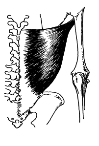 Действие: Разгибание, приведение и медиальная ротация плечевой кости при фиксированном начальном прикреплении. Подавляет активность плечевого пояса и способствует латеральному сгибанию туловища.
