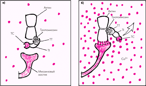 | Рис. 1.13. Функционирование тропомиозин–тропонинового комплекса во время расслабления (а) и сокращения (б) Красными кружочками обозначены Ca 2+ ; TC, TT и TI — тропонины C, T и I |