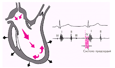 Последняя диастолическая фаза (фаза систолы предсердий) характеризуется сокращением миокарда предсердий и активным изгнанием крови из предсердий в желудочки (риc. 1.27). В конце этой фазы створки атриовентрикулярных клапанов «всплывают» и неплотно смыкаются — желудочек вновь готов к очередному сокращению. При определенных условиях (см. ниже) во время этой фазы может возникнуть IV дополнительный тон сердца.