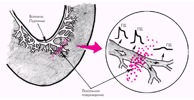 Следует упомянуть еще об одном механизме нарушения проведения ПД, который имеет значение, в частности, при формировании так называемого повторного входа волны возбуждения (re-entry) — одного из наиболее частых механизмов возникновения сердечных аритмий (см. ниже).