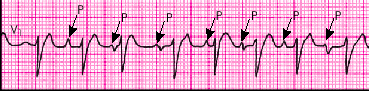 2. Наличие перед каждым желудочковым комплексом QRS' сниженного, деформированного, двухфазного или отрицательного зубца Р'.