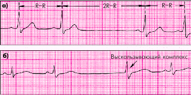 4. Во время длинных пауз возможно появление медленных выскальзывающих комплексов и ритмов (рис. 3.72, б).