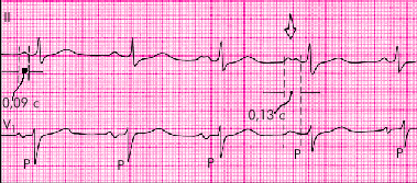1. Продолжительность интервала P–Q(R) увеличена преимущественно за счет длительности зубца Р (более 0,11 с).