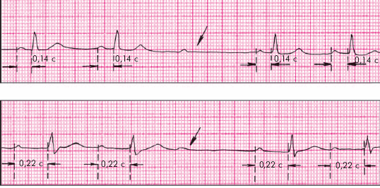 1. Увеличение продолжительности интервала P–Q(R) преимущественно за счет сегмента P–Q(R).