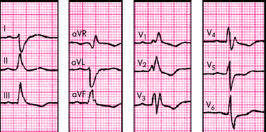 2. Резкое отклонение электрической оси сердца влево (угол от –30° до –90°).