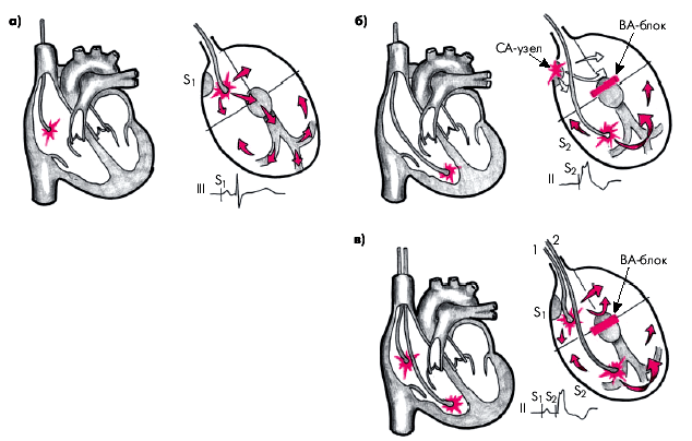 | Рис. 3.108. Однокамерные (а, б) и двухкамерная (в) электрическая стимуляция сердца. Слева — схема расположения электродов, справа — распространение искусственных стимулов по сердцу. S 1 — искусственная стимуляция предсердий; S 2 — искусственная стимуляция желудочков |