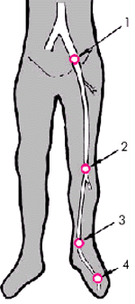 | Рис. 4.44. Стандартные позиции ультразвукового исследования артерий нижних конечностей: «1» — подвздошная артерия; «2» — подколенная артерия; «3» — задняя тибиальная артерия; «4» — терминальная ветвь передней тибиальной артерии |