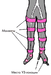 Затем приступают к измерению регионарного систолического АД в отдельных сегментах артерий нижних конечностей: в проксимальном и дистальном отделах бедренной артерии, в подколенной артерии и в артериях голени. Ультразвуковой датчик при этом устанавливают в третьей или четвертой позициях и получают допплеровское изображение кровотока в передней или задней тибиальной артерии. После этого в манжетку, установленную на уровне верхней трети бедра, нагнетают воздух несколько выше значения в момент полного прекращения кровотока в тибиальной артерии. Затем медленно выпускают воздух, снижая давление в манжетке и тем самым уменьшая сжатие артерии. При давлении в манжетке чуть ниже систолического артерия начинает пропускать в систолу первые пульсовые волны, которые фиксируются ультразвуковым датчиком. Так же определяют систолическое АД на всех четырех уровнях артериальной системы нижних конечностей.