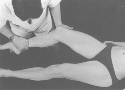 Тест: - пациент в положении лежа на спине, фиксирует тазобедренный и коленный суставы, одновременно осуществляет абдукцию бедра. Врач направляет силу на передне-латеральную часть ноги (проксимально по отношению к колену) в направлении экстензии, аддукции и внутренней ротации бедра. Другой рукой он фиксирует заднюю поверхность лодыжки и пытается разогнуть коленный сустав.