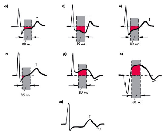 | Рис. 5.25. Различные виды ишемического и неишемического смещения сегмента RS–T при проведении проб с физической нагрузкой (схема). а - горизонтальное снижение (депрессия) сегмента RS–T; б - косонисходящее снижение; в - медленное косовосходящее снижение; г - быстрое косовосходящее снижение; д, е - ишемический подъем сегмента RS–T; ж - горизонтальное (ишемическое) снижение сегмента RS–T в сочетании с отрицательным зубцом U |
