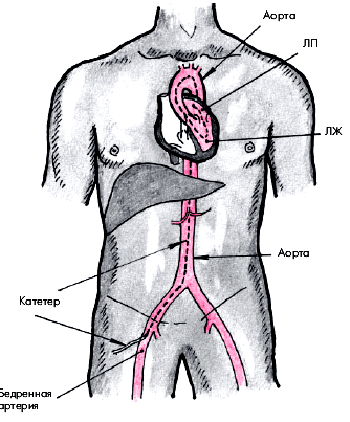 | Рис. 5.38. Схема ретроградного артериального доступа при катетеризации левых отделов сердца. Катетер введен в бедренную артерию, аорту и левые отделы сердца (ЛЖ и ЛП) |