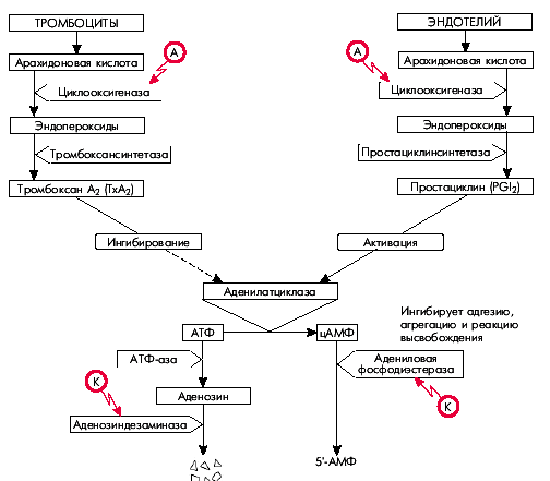 Действие тромбоксана А2 (ТхА2) и простациклина на агрегацию тромбоцитов реализуется благодаря их различному влиянию на аденилатциклазу, под действием которой АТФ превращается в цАМФ: тромбоксан А2 ингибирует это превращение, а простациклин — активирует. Следует помнить, что высокие концентрации цАМФ угнетают агрегацию тромбоцитов, тогда как уменьшение концентрации, наоборот, способствует агрегации. Именно поэтому простациклин, активирующий аденилатциклазу и увеличивающий содержание цАМФ, ингибирует адгезию, агрегацию и реакцию высвобождения тромбоцитов, а тромбоксан А2, наоборот, угнетая аденилатциклазу, замедляет переход АТФ в цАМФ. В результате уменьшается концентрация цАМФ, что способствует усилению адгезии и агрегации тромбоцитов.