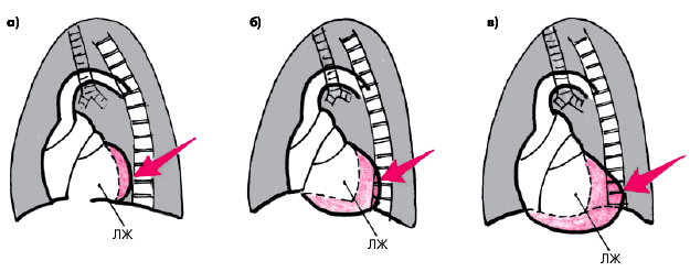 | Рис. 8.39. Рентгенологические признаки увеличения ЛЖ при исследовании в прямой проекции (схема): а — нормальные размеры ЛЖ; б — умеренная дилатация ЛЖ (удлинение дуги ЛЖ, закругление верхушки и смещение ее вниз); в — выраженная дилатация ЛЖ |