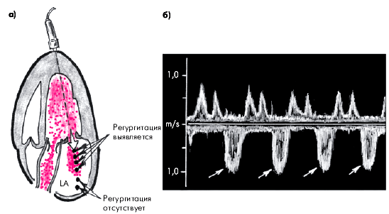 | Рис. 8.42. Картирование допплеровского сигнала у больного с митральной недостаточностью: а — схема картирования (черными точками отмечено последовательное перемещение контрольного объема); б — допплерограмма трансмитрального потока крови, зарегистрированная на уровне выходного отдела ЛП. Регургитация крови из ЛЖ в ЛП отмечена стрелками. |