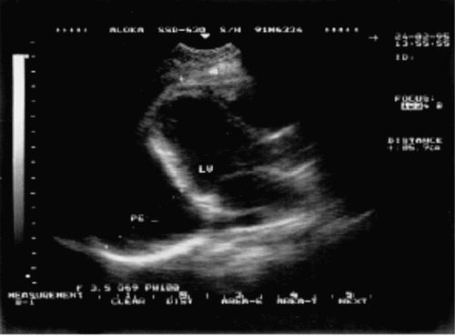 Незначительное количество выпота при М-модальном исследовании можно обнаружить только в области задней стенки ЛЖ, причем величина сепарации листков перикарда не превышает 3–5 мм (рис. 12.9). При двухмерном исследовании из парастернального доступа по короткой или длинной оси эхонегативное пространство также располагается за ЛЖ и имеет вид тонкого полумесяца.