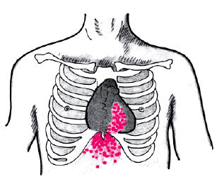 Боли в области сердца выявляются более чем у половины больных хроническим ЛС. Нередко боли возникают при физической нагрузке, однако нитроглицерин обычно не купирует боль, тогда как применение эуфиллина сопровождается положительным эффектом.