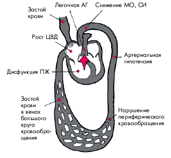 · синдром малого сердечного выброса, сопровождающийся снижением МО, АД и нарушением кровоснабжения жизненно важных органов (головного мозга, сердца, почек);